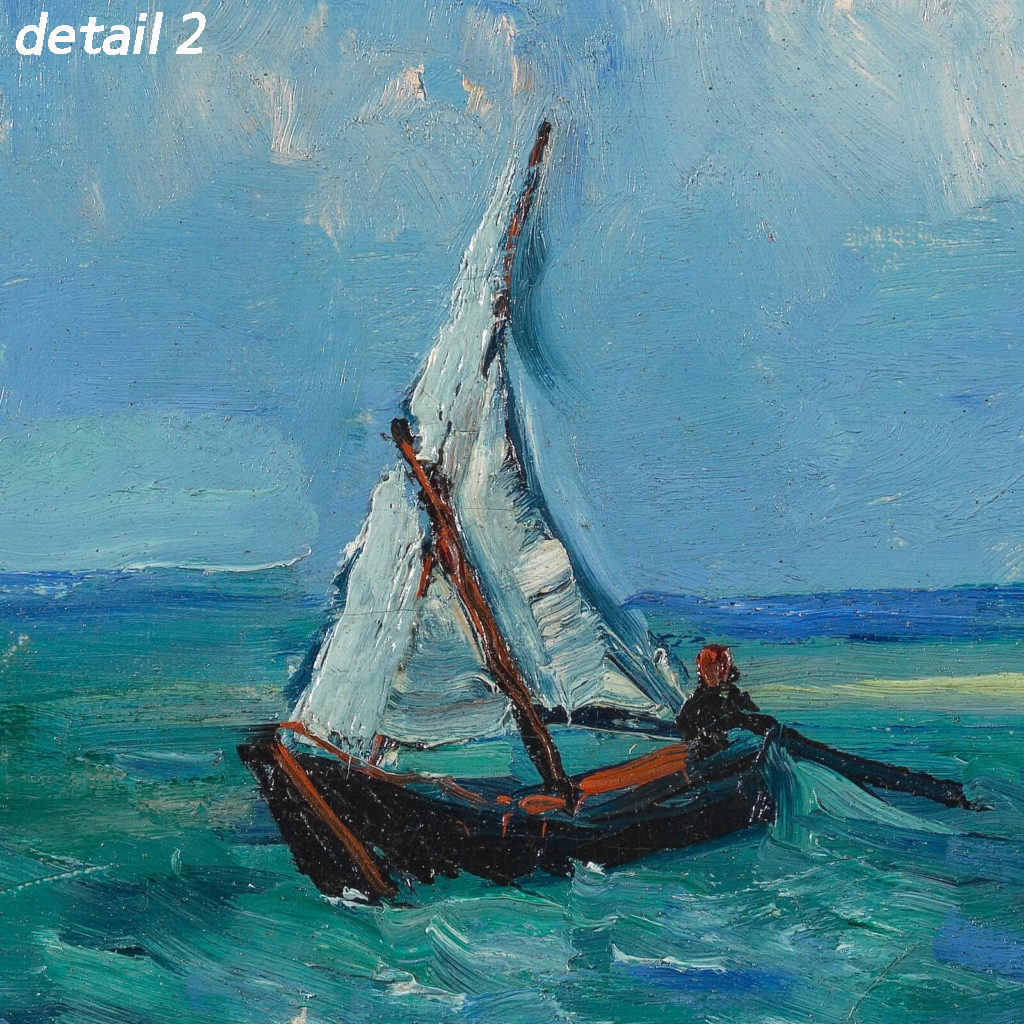 고흐는 이 여행 중에 팔레트 나이프를 사용하여 두터운 질감의 표현을 실험했습니다. 그는 파란색과 흰색을 대비시켜 거친 파도의 생동감을 전달하고, 멀리 펼쳐진 깊은 바다를 어두운 초록빛으로 묘사했습니다. 이러한 기법은 고흐의 작품에서 보다 직접적이고 강렬한 인상을 주는 요소로 작용했습니다.